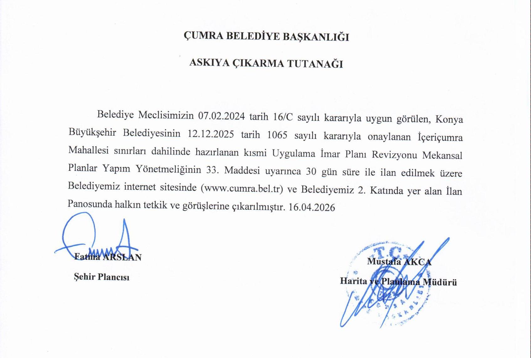 İçeriçumra Mahallesi sınırları dahilinde hazırlanan kısmi Uygulama İmar Planı Revizyonu